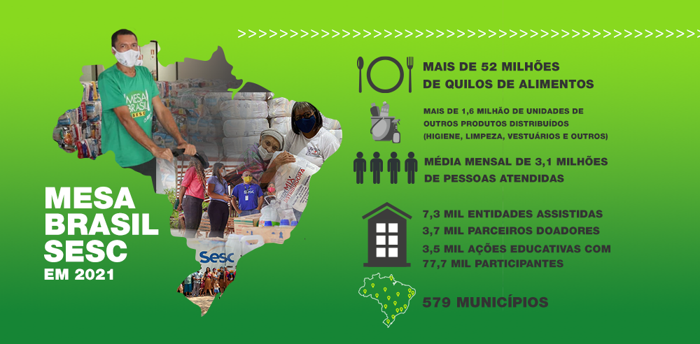 Para mitigar os impactos desse quadro, desde 1994, o Mesa Brasil Sesc combate à fome e, em 2021, conseguiu atender uma média mensal de 3,1 milhões de pessoas em mais de 500 cidades ao redor do país. Isso só foi possível graças às 52 mil toneladas de doações arrecadadas ao longo do ano.