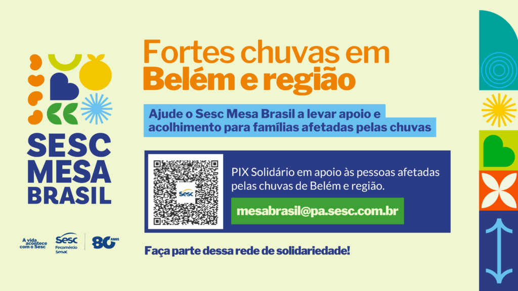 Para ampliar essa rede de solidariedade, o Sesc Mesa Brasil convida a sociedade a participar por meio de doações via PIX, uma forma prática, rápida e segura de contribuir. Os valores arrecadados são integralmente convertidos em alimentos e itens de primeira necessidade, que serão destinados às famílias afetadas pelas fortes chuvas em Belém e região. A chave pix oficial é mesabrasil@pa.sesc.com.br.
